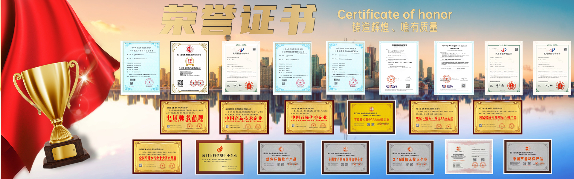 厦门迎龙水务科技集团有限公司是上海迎隆水务工程设备(集团)有限公司全资子公司,注册资金8666万元,是集研发、生产、销售、安装钢塑复合水箱、不锈钢水箱、箱泵一体化、BDF地埋式水箱、变频恒压给水设备于一体的综合性供水公司。公司通过ISO9001:2015标准认证,同时获得福建省卫生厅颁发“卫生许可批件”“福建省疾病预防控中心的检测报告”以及荣获“中国驰名品牌”“中国百强优秀企业”“中国高新技术企业”“全国给排水行业十大著名品牌”“国家权威检测质量合格产品”“质量.服务.诚信AAA企业”"科技型中小企业”等荣誉,并且获得多项行业专利,在国内外有较高的知名度。